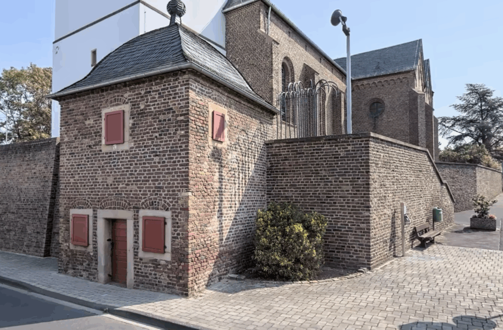 | Das zweigeschossige Wachhaus ist seitlich vor den Kirchturm gesetzt und an der Straßenseite in die Stützmauer integriert. Erbaut im Jahre 1753 und seit 1982 eingetragenes Denkmal. (Quelle: Wikipedia) |